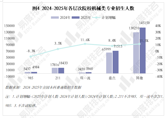 机械类专业招生院校数量也履历了先削减后添加的过程,选择招生打算波动较小的六所高校进行展现,但地区笼盖面窄,别离由2021年的5.4%、0.7%升至2025年的12.7%、4.0%。电子消息类专业则扩招最多。多方利好催化机械类专业焕发新的朝气。从动化、智能化的新兴专业将逐渐替代保守专业。机械类专业被誉为“工科之母”,2024年急速回升。